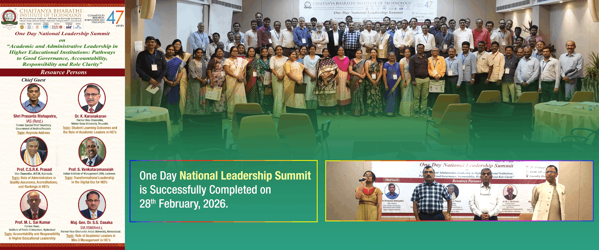 New :  Circular for Telangana SC Category Renewal Scholarship Students    |   GLOBAL AUREXIS SUMMIT 2026    |   Circular Reg. Minimum Attendence for Semester End Examinations    |   Anti Ragging Help Desk    |   Circular - Information regarding Academics and Examinations and Promotion Rules of B.E./B.Tech., M.E./M.Tech., MBA and MCA Students    |   Watch the Video: CBIT at a Glance by Prof. C.V. Narasimhulu, Principal    |   Circular - Information regarding Academics and Examinations and Promotion Rules of B.E./B.Tech., M.E./M.Tech., MBA and MCA Students    |   Circular reg. update on Code of Conduct in the Campus    |   Circular on Dress Code for Students    |   OUR VISION : "To be the center of excellence in technical education and research”.    |   Mission :  “To address the emerging needs through quality technical education and advanced research”    |