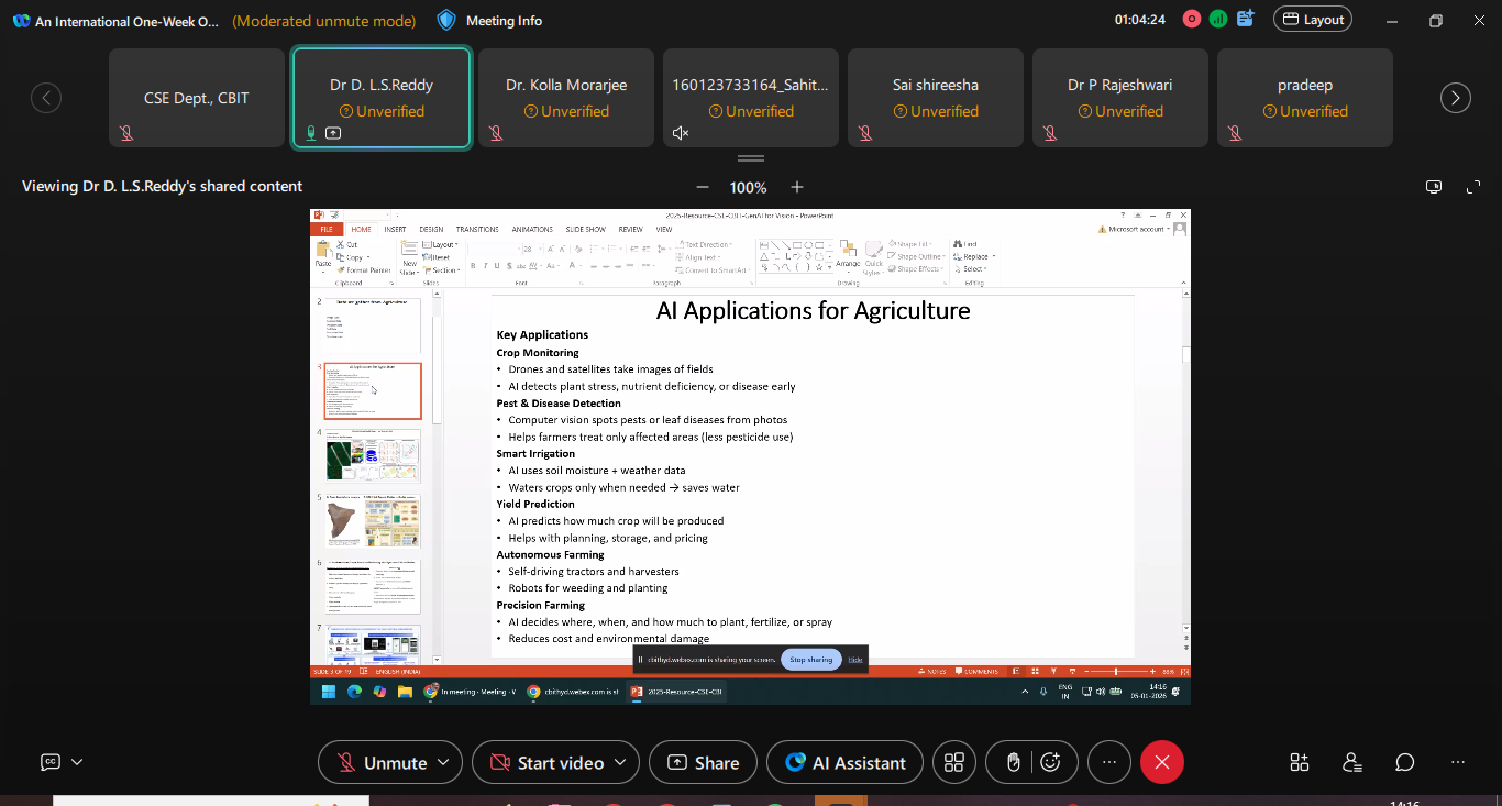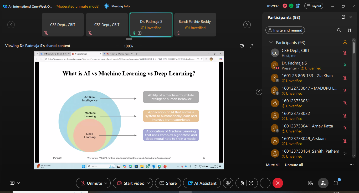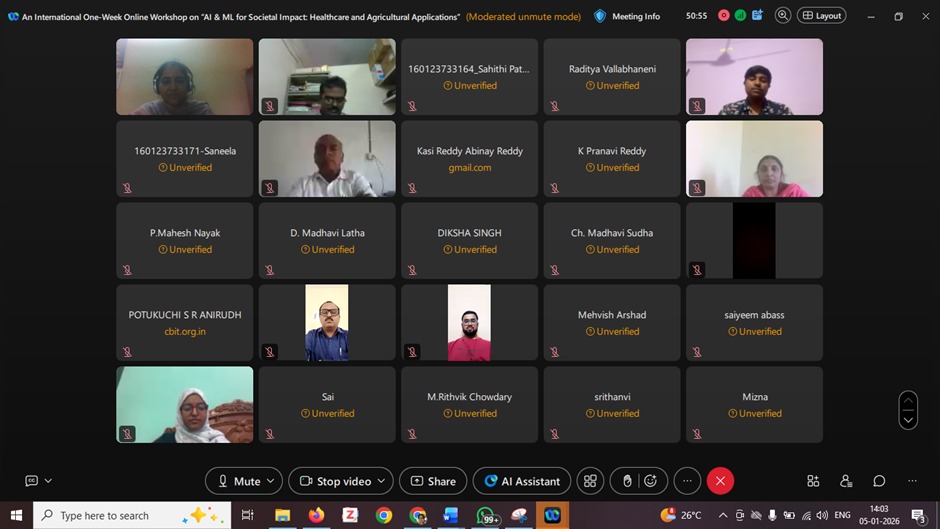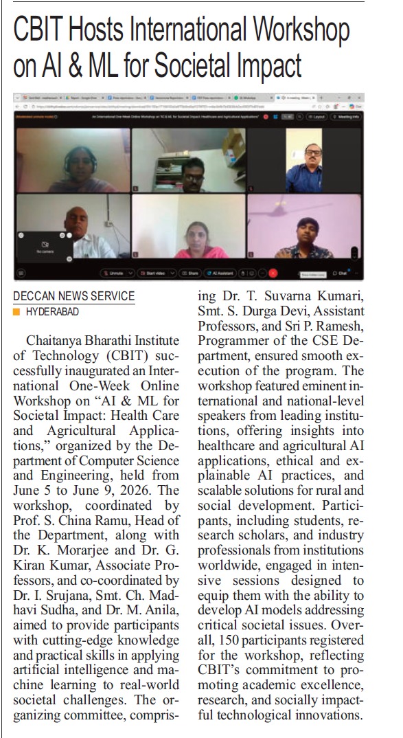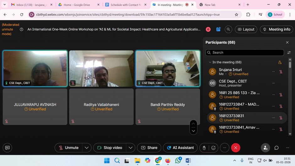The Department of Computer Science and Engineering at Chaitanya Bharathi Institute of Technology, Hyderabad successfully organized an International One Week Online Workshop on ” AI & ML for Societal Impact: Health Care and Agriculture Applications”, January 5th to 9th, 2026. The session has eminent, Expert persona as Resources persons from International and National level Institute and Industry. The Faculty Coordinators are Prof. S. China Ramu, Dr Kolla Morarjee, Dr G Kiran Kumar and Co-coordinators are Dr. I. Srujana, Smt Ch, Madhavi Sudha and Dr. M. Anila of CSE Department. The Session was scheduled from 10.00 AM to 4.00 PM, and the Intended participants are Students, Research Scholars and Industry professions. The number of participants is 150. The Outcome of this workshop is as follows: Participants will be able to Apply AI & ML Techniques to real societal problems. Develop healthcare and agricultural AI models. Understand ethical and explainable AI practices. Design scalable AI Solutions for rural and social development.