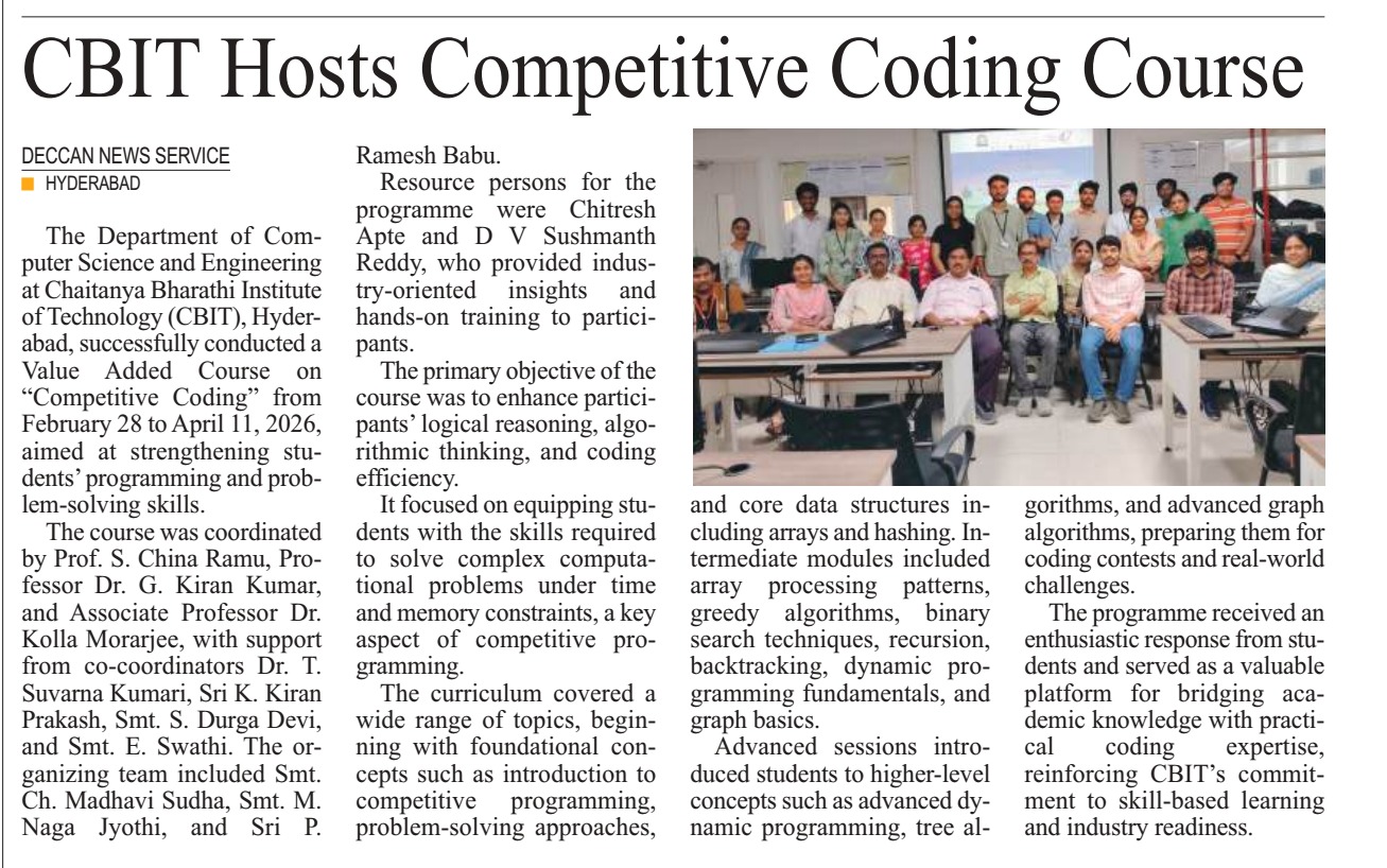 The Department of Computer Science and Engineering at Chaitanya Bharathi Institute of Technology, Hyderabad successfully organized a Value-Added Course on ” Competitive Coding”, February 28th to April11th, 2026. The session has eminent Resources persons from Amazon Mr. Chitresh Apte SDE and Mr, D, V. Sushmanth Reddy, Amazon. The Faculty Coordinators are Prof. S. China Ramu, Dr G Kiran Kumar, Dr Kolla Morarjee and Co-coordinators are Dr. T. Suvarna Kumari, Sri K. Kiran Prakash, Smt Durga Devi, Smt. E. Swathi. Organizing Team Members are Smt Ch. Madhavi Sudha, Sri P.Ramesh Babu, Smt M. Naga Jyothi of CSE Department. The Session was scheduled from 10.00 AM to 4.00 PM, and the Intended participants are VI Semester Students. The number of participants is 35. The Main Objective of this Course is as follows: To enhance participants problem-solving and logical reasoning skills through competitive coding practices, familiarize with algorithmic thinking, data structures, and efficient coding techniques required to solve complex computational problems under time and memory constraints. The following topics were discussed along with practical sessions: Foundations & CP Mindset: Introduction to Competitive Programming, Problem Solving Approach, Core Data Structures (Arrays & Hashing). Core Patterns & Intermediate Techniques: Array Processing Patterns, Greedy Algorithms, Binary Search Techniques, Recursion & Backtracking, Dynamic Programming Fundamentals, Graph Fundamentals. Advanced Topics & Contest Readiness: Advanced Dynamic Programming, Tree Algorithms, Advanced Graph Algorithms.