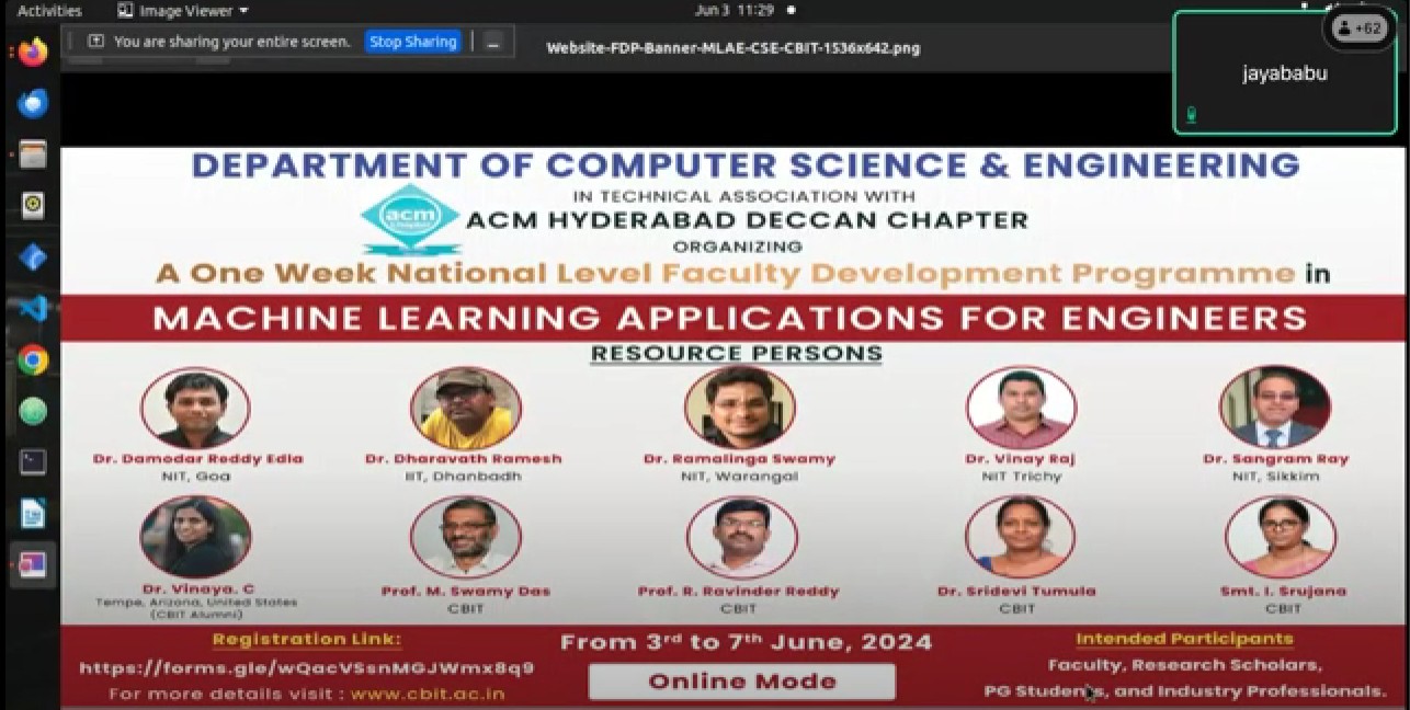 The Department of Computer Science and Engineering at Chaitanya Bharathi Institute of Technology, Hyderabad has conducted a One Week National Level Faculty Development Programme on “Machine Learning Applications for Engineers” from June 3rd to 7th, 2024. The Faculty Coordinators for the FDP is Prof R. Ravinder Reddy , Professor and Dr. T. Sridevi, Associate Professor, Department of CSE. Co-Coordinators for the FDP is Smt. Ch.Vijaya Lakshmi, Smt A.Sangeeta,Sri. J.Shiva Sai, Assistant Professors and Organizing Committee for the FDP is Smt. E. Swathi, Smt Isha Padhy, Smt B. Deepthi, Sri. K. Karthik,Assistant Professors, Smt. M. Naga Jyothi, Programmer, Sri. B. Sangeev Kumar, Programmer, Sri. P. Ramesh Babu, Programmer.