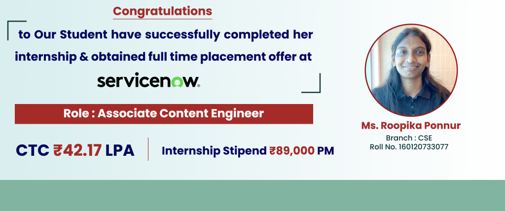 Ms. Roopika Ponnur (CSE) Roll No.160120733077 selected in Servicenow with CTC ₹42.17 LPA